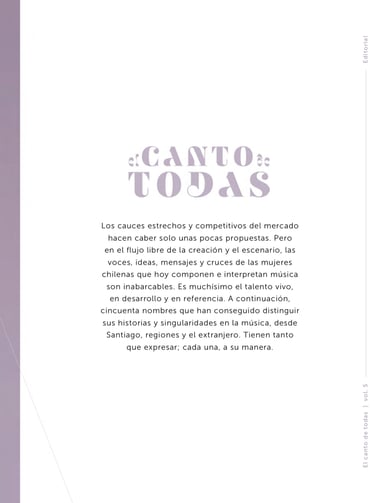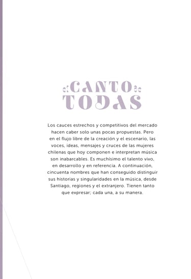 En avril 2025, la SCD (Société Chilienne du Droit d’Auteur) a publié la cinquième édition de sa revue El Canto de Todas, consacrée à la reconnaissance des femmes musiciennes chiliennes qui développent leur art à l’intérieur comme à l’extérieur du pays. Cette publication célèbre la diversité des styles, des genres et des parcours de créatrices qui exercent en tant que compositrices, autrices, chanteuses et instrumentistes.