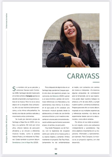Son nom civil est déjà particulier, et c’est ainsi que Yascara León Contreras (1981, Santiago) a décidé de le transformer en nom d’artiste Carayass dès qu’elle a choisi d’entamer une carrière musicale en solo. Mais ce n’est pas le seul aspect atypique de sa biographie. Cette auteure-compositrice-interprète, proche des racines folkloriques latino-américaines et des rythmes afro-caribéens, a mené une vie marquée par des changements radicaux et des déplacements entre continents.