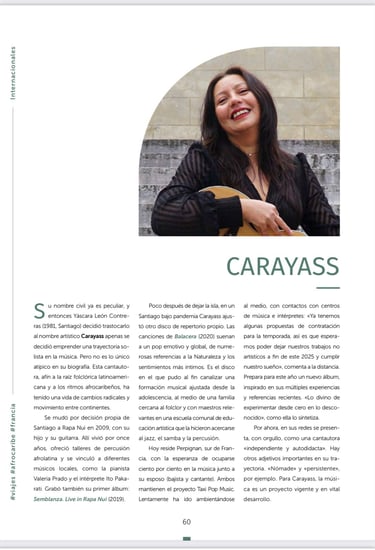 Peu de temps après avoir quitté l’île, dans un Santiago en pleine pandémie, Carayass a mis au point un autre album de son propre répertoire. Les chansons de Balacera (2020) évoquent une pop émotive et universelle, riche en références à la nature et aux sentiments les plus intimes.
